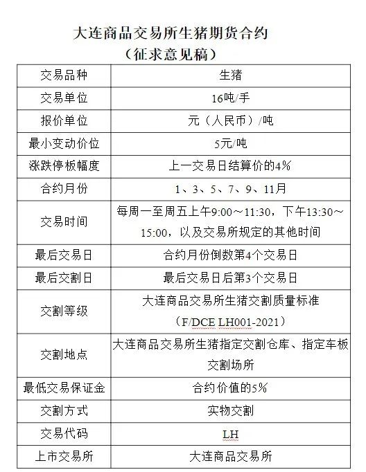 大商所相关负责人表示,历经近20年跟踪和研究,在全面深入市场调研及广泛征求意见、充分论证基础上,大商所完成了生猪期货合约规则设计工作。下一步,大商所将梳理并研究各方意见和建议,进一步完善合约和规则,与各方共同做好上市前各项准备工作,确保生猪期货平稳上市和安全运行。