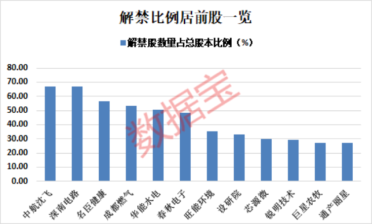 按照解禁股数量占总股本的比例进行统计,下周解禁股中,共有5股解禁股数量占总股本比例超过50%,分别是中航沈飞、深南电路、名臣健康、成都燃气和华能水电。其中,中航沈飞和深南电路的解禁比例最大,解禁股数量占总股本的比例均为67.05%。