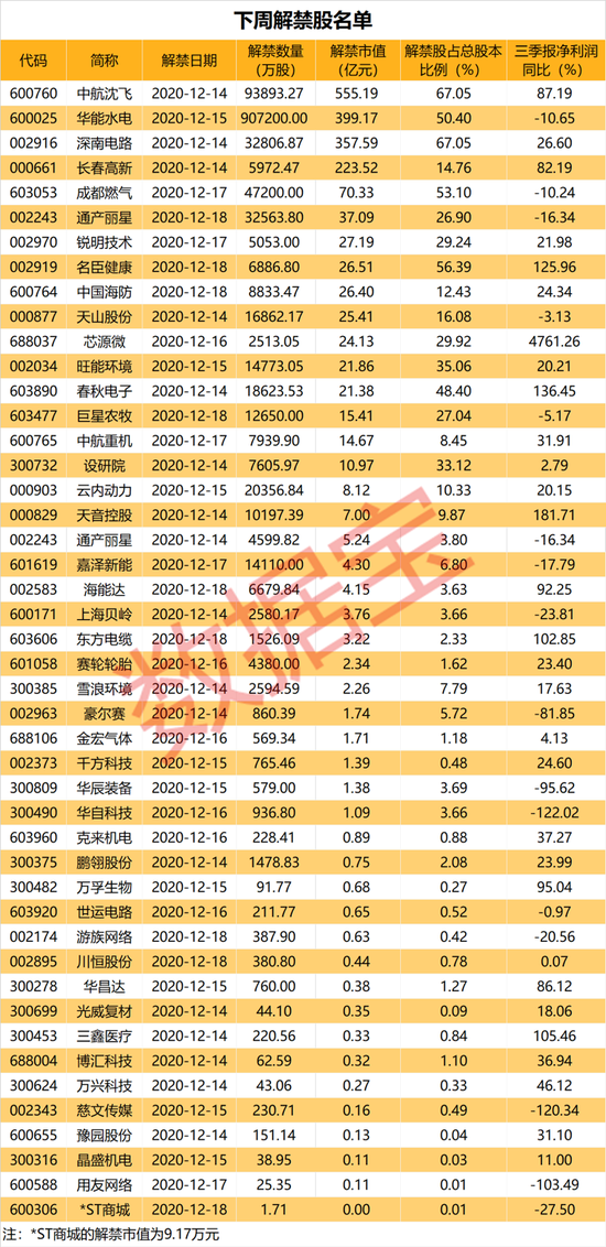华能水电、深南电路和长春高新的解禁市值均超百亿元,解禁市值分别为399.17亿元、357.59亿元和223.52亿元,华能水电和深南电路的解禁股主要是发行前股份限售流通,长春高新的解禁股主要是定向增发机构配售股份。