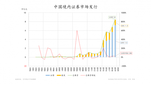 下面这张是中国境内证市发行的结构,可以看到股票(黄色柱体)发行占比较小,债券(蓝柱)七万多亿,实际上应该更多,这个里面债券仅仅包括了交易所的债券,而不包括银行间市场还有发改委批文的企业债。