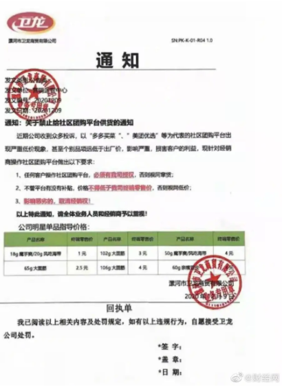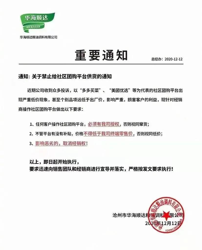 12月12日,有消息称,沧州市华海顺达粮油调料有限公司发布“关于禁止给社区团购平台供货公司供货通知”,该公司称,其收到多方投诉,以多多买菜、美团优选等为代表的社区团购平台出现严重低价现象,甚至个别产品远低于出厂价,影响严重,损害客户利益,现针对经销商操作社区团购平台做出以下要求。