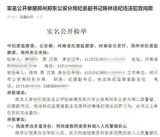 12月13日,网络上出现实名举报郑州市公安局郑东公安分局二级警督、纪委副书记、执法执纪监察室副主任陈林涉嫌违纪违法犯罪行为信息。