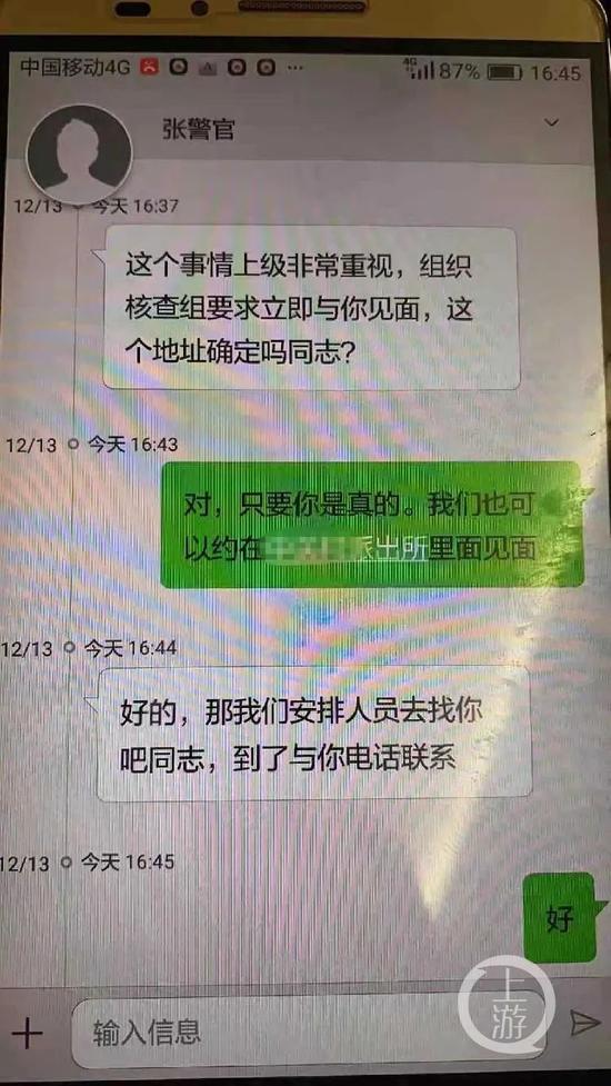 12月13日下午,举报人李先生向上游新闻记者发来的图片显示,一名自称是郑州市公安局纪委的张警官发短信给他:“这个事情上级非常重视,组织核查组要求立即与你见面。”双方约定,12月14日在北京海淀区见面。