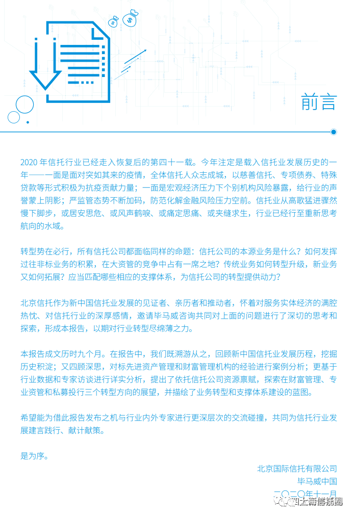 2020年11月,北京国际信托有限公司联合毕马威中国发布《道阻且长,行则将至——中国信托行业发展趋势和战略转型研究报告》,这份历时九个月的报告旨在探索信托公司如何发展本源业务、如何提升在大资管行业的竞争力、如何推动传统业务转型及扶持新业务拓展等行业共同面临的命题,以期把握行业未来的发展方向。北京信托作为新中国信托业发展的见证者、亲历者和推动者,怀着对服务实体经济的满腔热忱、对信托行业的殷切企盼,邀请毕马威共同对中国信托行业发展等问题进行了深切的思考和探索,形成本报告,以期对行业转型尽绵薄之力。