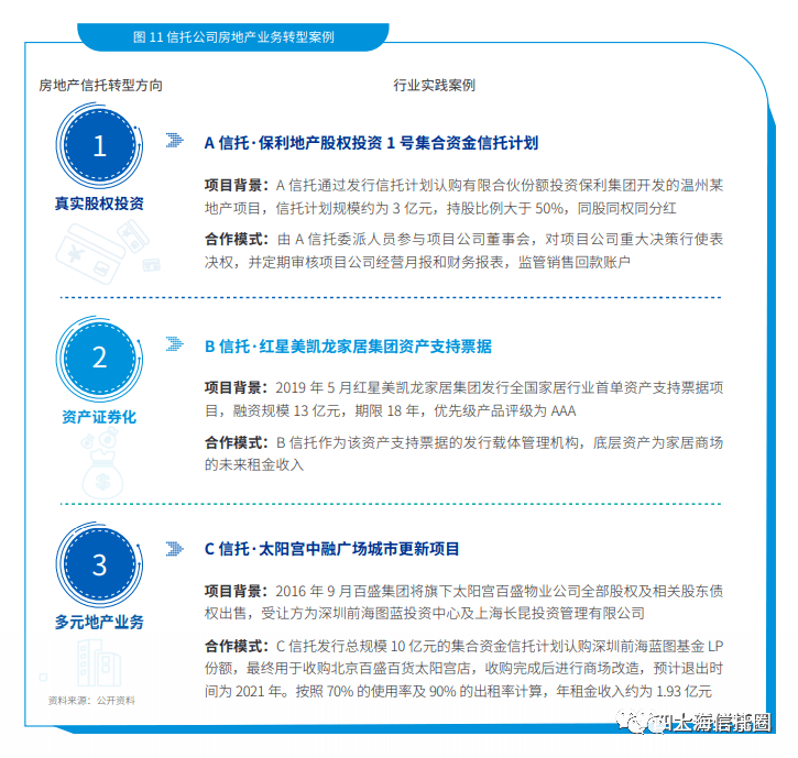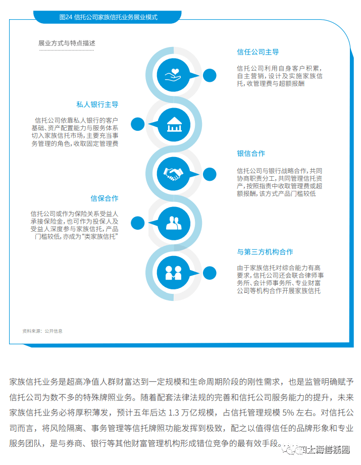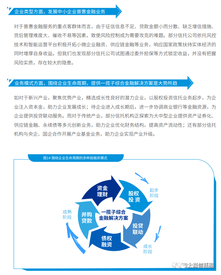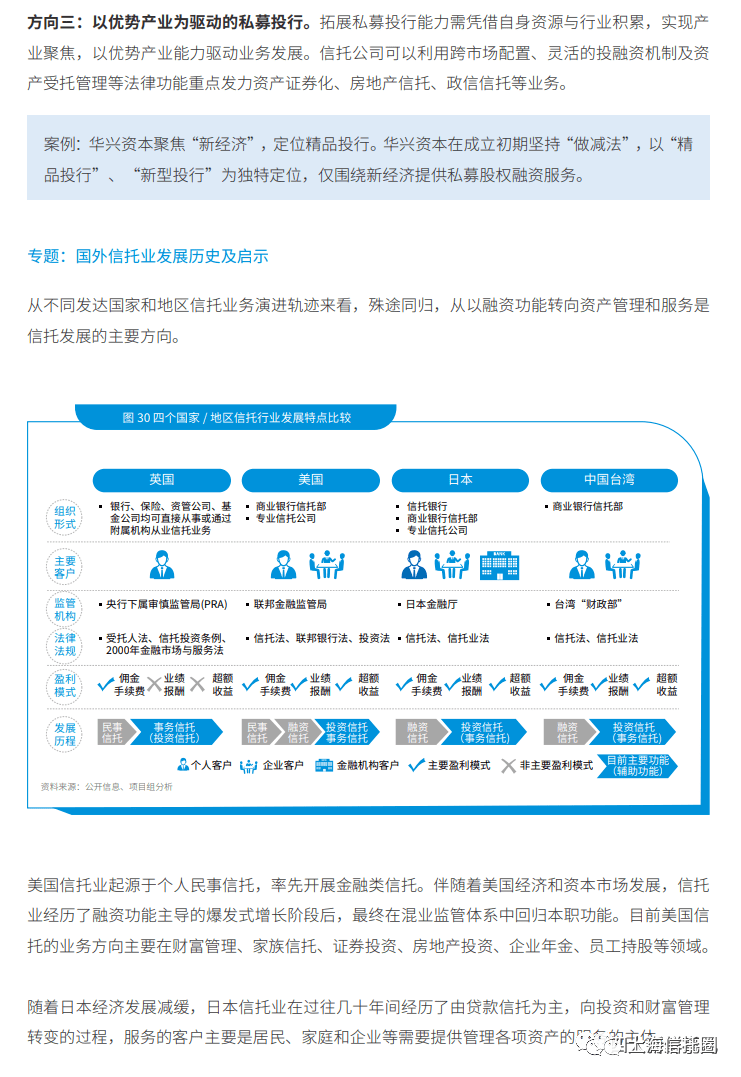 展望未来,我国处于经济转型深化、产业升级不断推进的重要战略机遇期,我国信托业必将继续发挥信托制度优势、灵活服务实体经济,于未来一段时间内在构建双循环新发展格局中有所作为。对照发达国家地区信托业的发展路径,可以预期随着我国金融监管体系的逐步完善,各类金融机构专业能力进一步提升,信托公司的融资服务功能将进一步弱化。未来信托公司的发展将结合信托制度的本源特性,以承担其他金融机构部不具备或不完全具备的“真信托”功能,回归“受人之托、代人理财”定位。我们相信,功能全面、服务专业、品种丰富、投向多元的现代信托体系也是中国信托行业的演进方向。