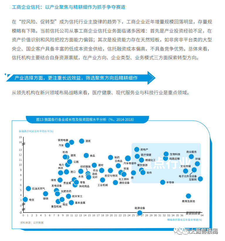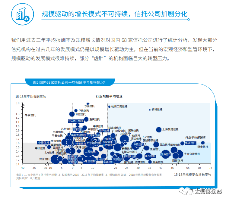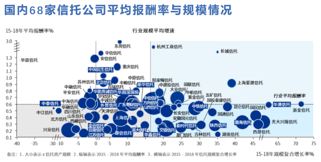 通过对过去三年平均报酬率及规模增长情况对国内68 家信托公司的统计分析,可以发现大部分信托机构在过去几年的发展模式仍是以规模增长驱动为主,但在当前的宏观经济和监管环境下,规模驱动的发展模式很难持续,部分“虚胖”的机构面临巨大的转型压力。
