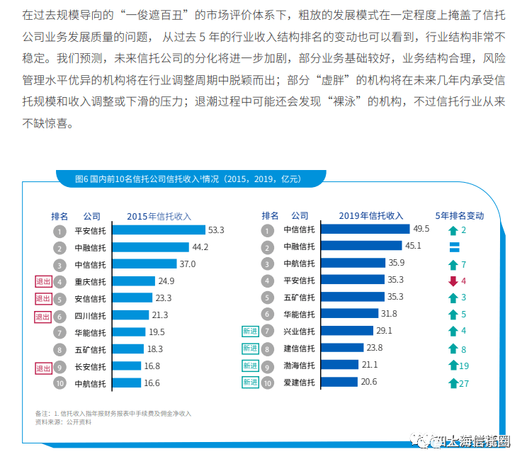 从过去5年的行业收入结构排名的变动也可以看到,行业结构非常不稳定。可以预测,未来信托公司的分化将进一步加剧。