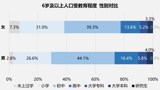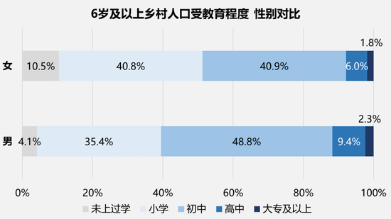如果单看乡村人口,差别更为明显。超过一半的女性教育止步于初中之前,而男性这一数字不到40%。