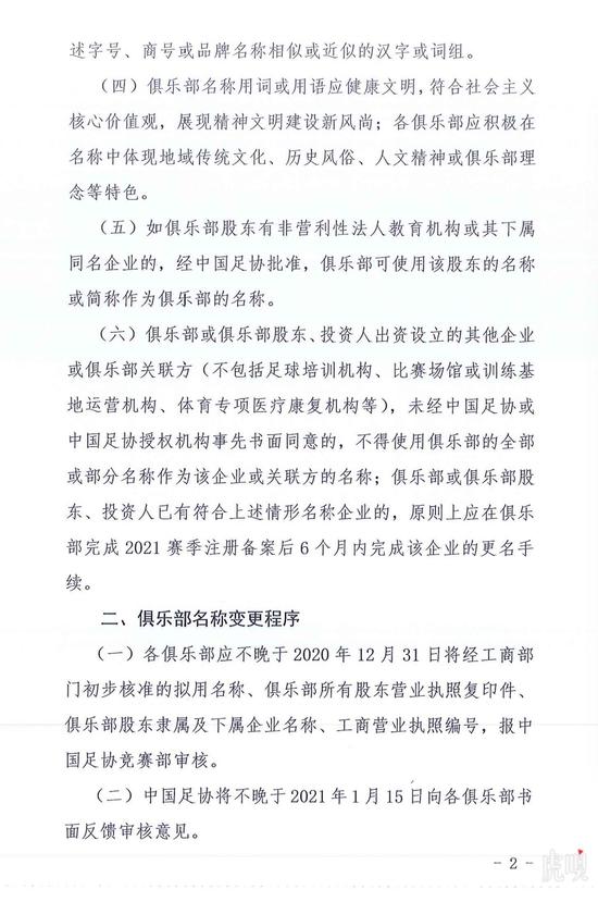 按照新规,参加中超、中甲及中乙联赛的俱乐部应在2021赛季开始前完成俱乐部名称非企业化变更。各俱乐部应不晚于2020年12月31日将经工商部门初步核准的拟用名称等报中国足协竞赛部审核,不晚于2021年2月28日在中国足协完成2021赛季的注册手续。