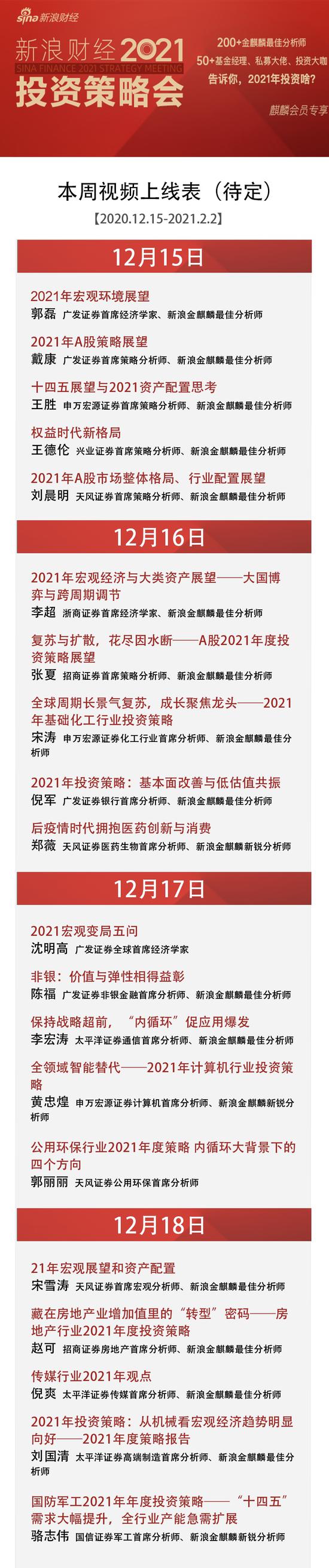 新浪理财大学特别推出《新浪财经2021投资策略会》,200+金麒麟最佳分析师,50+基金经理、私募大佬……超多行业大咖告诉你,2021该投什么!