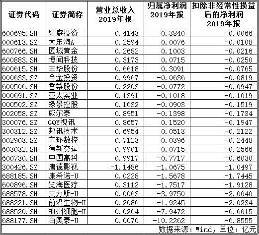 如果以2019年年报作为统计阶段,约有52家上市公司营收低于1亿元,且扣非前/后净利润为负,其中,未被风险警示的上市公司约为22家。