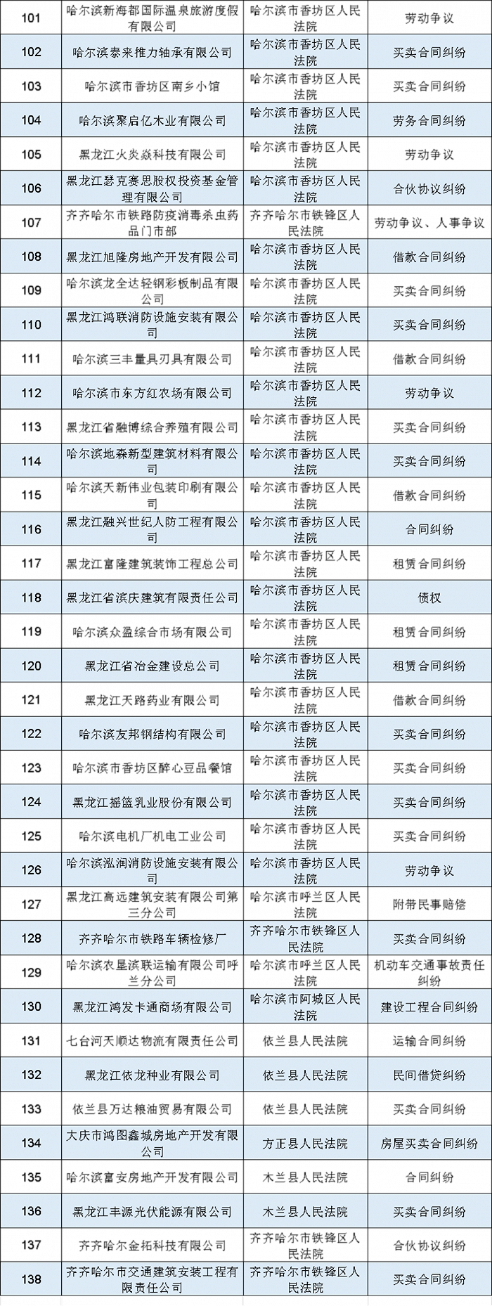 黑龙江高院曝光138家失信企业,哈尔滨东北龙工贸、哈尔滨凯悦华源医药等在列