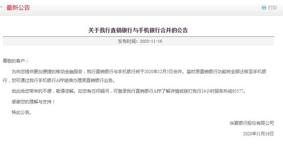 消金界注意到,2020年11月16日,华夏银行在官网发布公告称,2020年12月5日,华将直销银行和手机银行合并,直销银行的功能将全部迁移至手机银行。