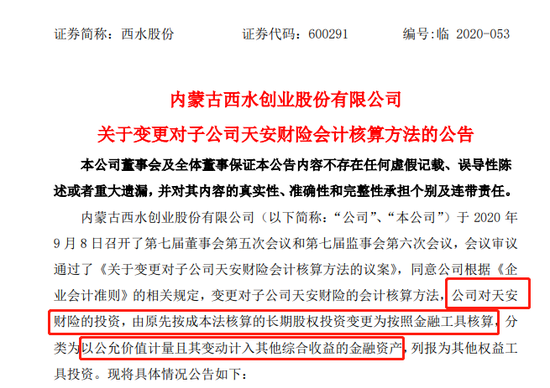 类似的案例其实A股不少,2020年9月8日,西水股份公告变更对子公司天安财险的会计核算方法,原因也是子公司被接管。公司公告表示,2020年7月17日,天安财险被银保监会实施接管。从接管之日起,天安财险股东大会、董事会、监事会停止履行职责,相关职能全部由接管组承担。因此,公司不再拥有对天安财险控制权。