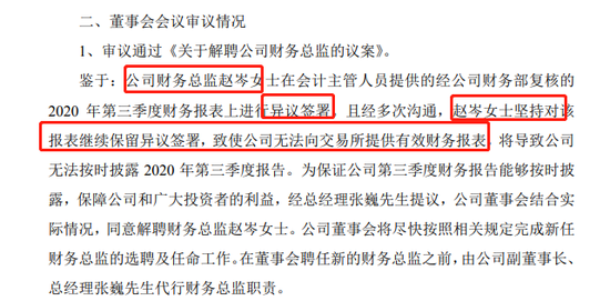 10月30日披露三季报的当天,因为赵岑的异议致使无法向交易所提交财务报表,公司当场就解聘了其财务总监职务,此次是再次解聘其董秘和董事职务。