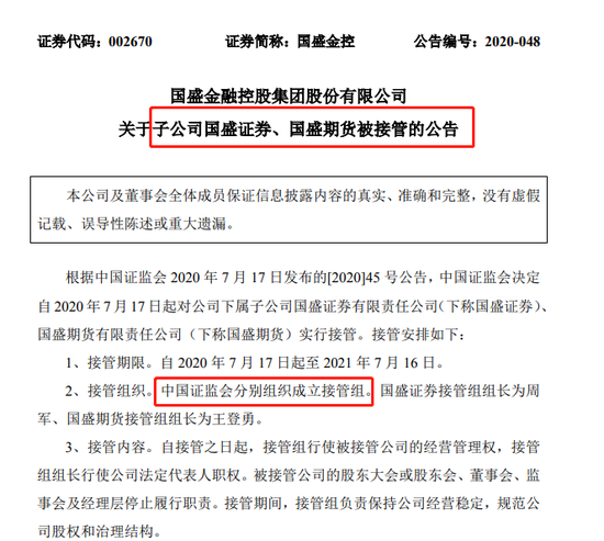 2020年7月17日,国盛证券和国盛期货被证监会接管,接管原因为“国盛证券、国盛期货隐瞒实际控制人或持股比例,公司治理失衡,为保护投资者合法权益”,所以实行接管。随后8月14日,公司控股股东张家港财智、前海远大、凤凰财鑫以及凤凰财智被证监会立案调查。