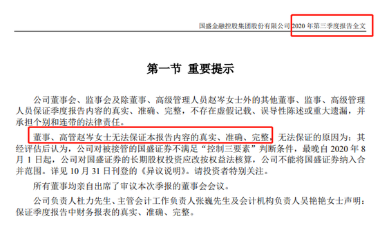 接管2个月后,10月30日,公司发布2020年三季报,赵岑则表示“无法保证年度报告的真实、准确和完整”。无法保证原因为:经评估后认为,公司对被接管的国盛证券不满足“控制三要素”判断条件,按照其自身的专业判断,最晚自2020年8月1日起,公司对国盛证券的长期股权投资应该从成本法改为权益法核算,公司不能将国盛证券纳入合并范围。