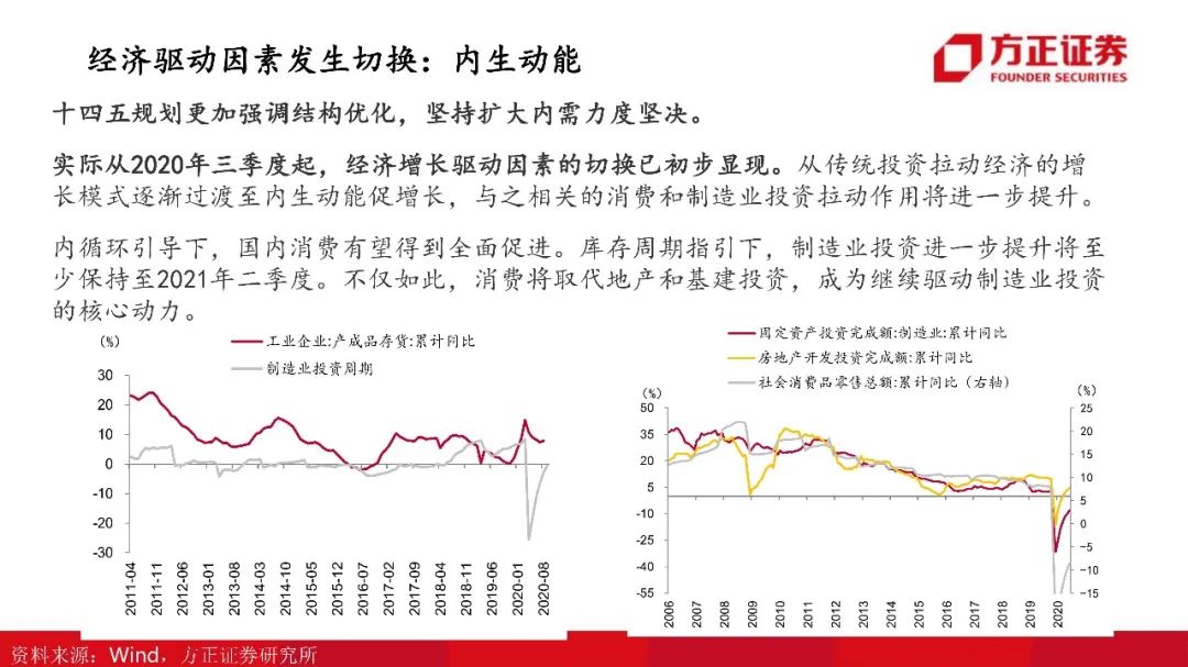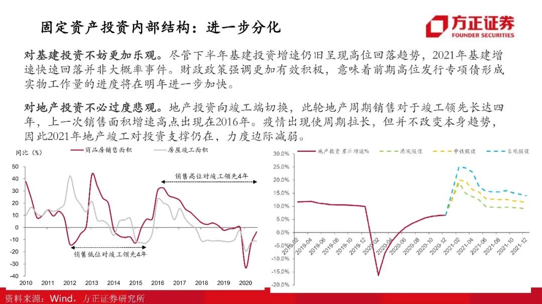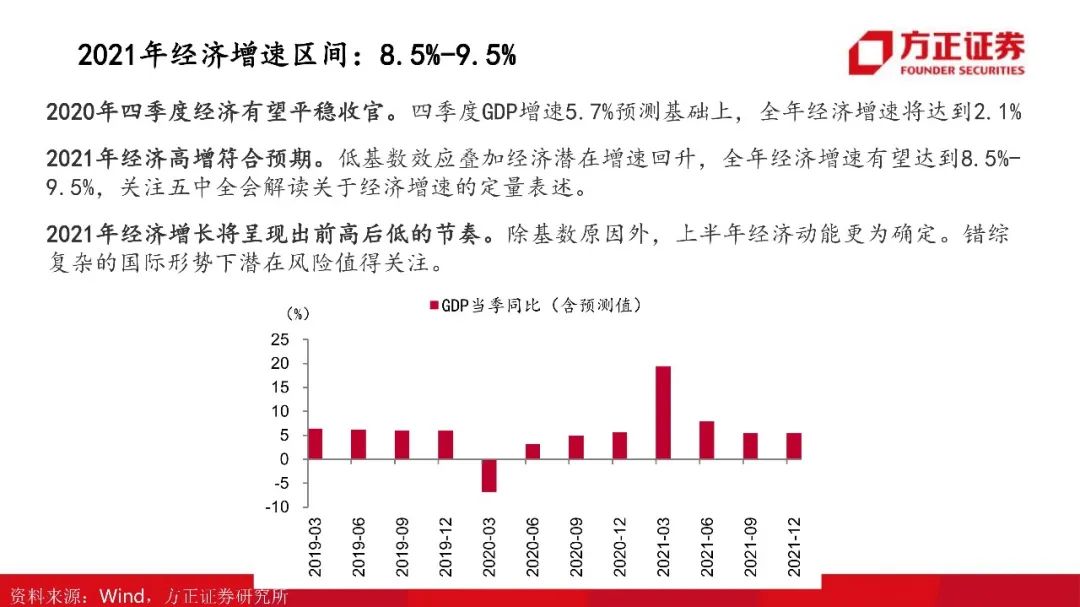 2、2021年经济增长将呈现出前高后低的节奏。除基数原因外,上半年经济动能更为确定。错综复杂的国际形势下潜在风险值得关注。