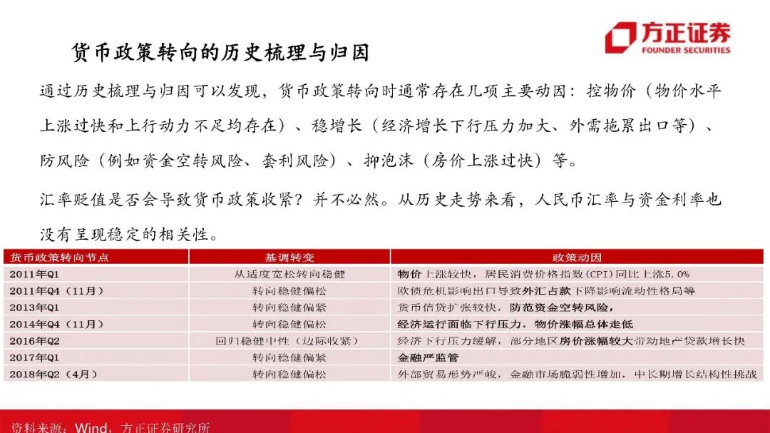 4、货币政策框架的重点可以粗略总结为三个阶段:调节通胀为主——稳定经济为主——防范金融风险为主。关注外汇占款重新转向流入的可能性,对基础货币创造模式有根本性改变。