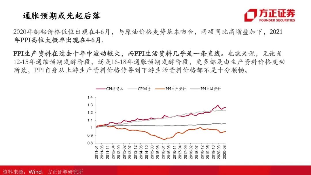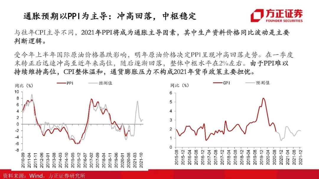 3、受今年上半年国际原油价格暴跌影响,明年原油价格决定PPI呈现冲高回落走势。在一季度末转正后迅速冲高至近年来高位,随后逐渐回落,整体中枢水平在2%左右。由于PPI难以持续维持高位,CPI整体温和,通货膨胀压力不构成2021年货币政策主要担忧。