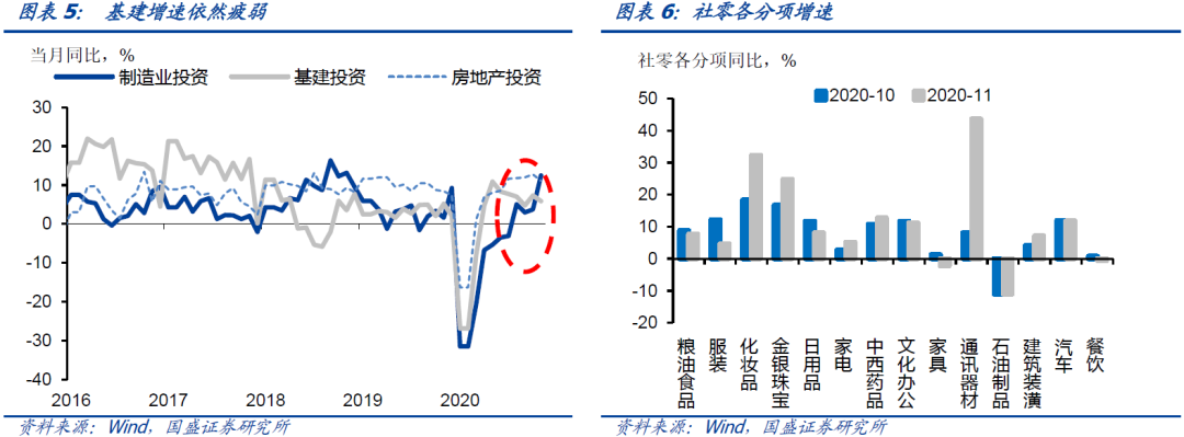 消费恢复速度依然相对缓慢。11月社会消费品零售总额同比增长5.0%,增速较上月提升0.7个百分点。但从分项来看,除通讯器材、化妆品、金银珠宝等受益于双十一有明显增长之外,其余消费分项都保持平稳甚至有所下降。餐饮收入同比增速在10月短暂转正之后,11月增速再度回落1.4个百分点落入负增长区间。服装、日用品、粮油食品等必选消费增速都有不同程度的下降,反映居民消费能力的不足。整体消费恢复速度缓慢,预计双十一退出后这一态势会体现的更为明显。