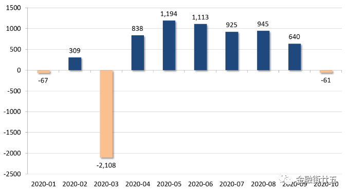 在疫情冲击下,我国在某种程度上承担了全球最后供应商的角色,有效填补了全球防疫物资等必需品和其他工业品的供给缺口。因此,今年整体来看,我国出口表现不俗。再加上疫情管控措施限制了出境旅游,令“旅行”这一主要的逆差来源大幅萎缩。由此,跨境代客涉外收付款口径下,1-10月经常项目逆差收窄至340亿美元,去年同期为逆差1037亿美元;相应,经常项目下的结售汇由去年前10个月的逆差559亿美元转为顺差494亿美元。同时,经常项目下的净结汇也符合人民币升值的时间摆布:在6-7月人民币升值的第一阶段,经常项目下实际整体为净售汇,月均净售汇规模不大,为17亿美元;8-10月,经常项目转为月均净结汇58亿美元。其月度数据上的边际变化,与人民币升值的基本趋势吻合。