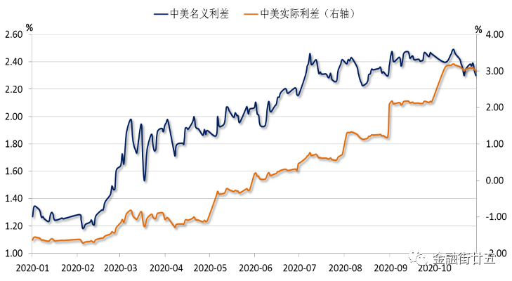 经济的稳步复苏增强了人民银行维持货币政策正常化的底气,与大幅宽松的美联储形成对比。由此,以10年期国债收益率为标杆的中美利差逐步拉宽,最大利差幅度达249Bps,人民币资产的吸引力凸显。但从图3中可见,中美名义利差的边际拓宽主要是在7月以前,8月之后,中美名义利差并没有继续走扩,而是在高位震荡;以剔除通胀影响的中美实际利差衡量,也是从6月初开始转为正利差,此后稳步扩大。综上,从利差的角度而言,也无法解释8月初以来的人民币加速升值。