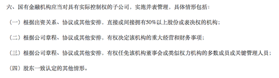 在并表方面,通知表示,国有金融机构应当对具有实际控制权的子公司,实施并表管理,具体情形包括四种: