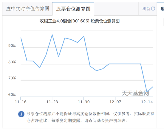 事实上,某平台对广发高端制造、农银汇理工业4.0的仓位测算也进行了下调。广发高端制造测算的仓位从70.24%调整至50.24%。农银汇理工业4.0也从月初的78.56%调整至66.24%。