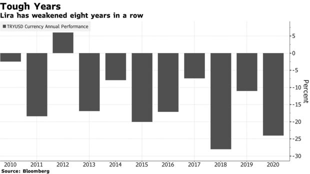 今年以来,土耳其里拉贬值25%,但这一点都不稀奇。毕竟里拉已经连续八年收跌,且多数年度下跌幅度在10%以上。但在土耳其总统埃尔多安出人意料地转向更为正统的货币政策后,有些人开始相信2021年的情况可能会有所不同。