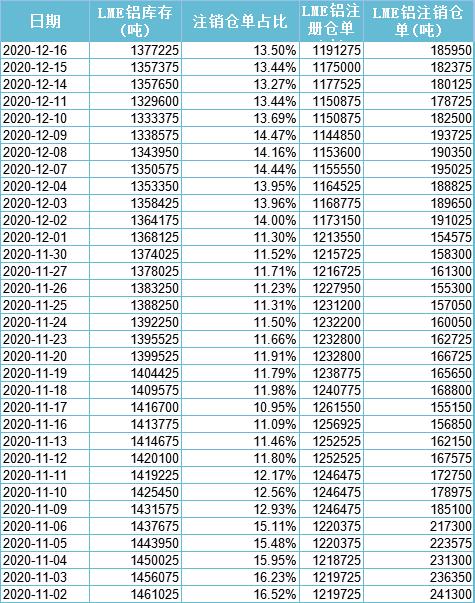 LME公布的数据显示,截至12月16日,LME铝注销仓单连增三日至185950吨,注销占比略有反弹至13.50%,不过较上周有所回落。注册仓单近几日现增加姿态,目前升至1191275吨。