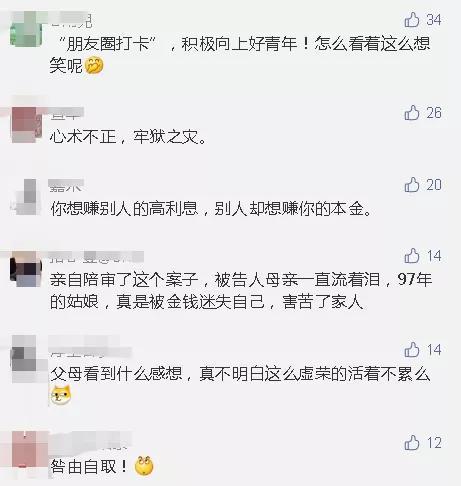 在该“白富美”被判后,有网友表示,“亲自陪审了这个案子,被告人母亲一直流着泪,97年的姑娘,真是被金钱迷失自己,害苦了家人。”