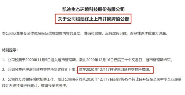 12月16日收盘后,当日晚间。凯迪退发布公告,公司30个交易日退市整理期已满,12月17日摘牌退市!