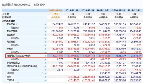 然而,从2015年、2016年净利润盈利2.38亿、3.34亿元之后,公司从2017年开始就连年巨亏,盈利时每年2、3亿元,亏损时一年就几十亿。2017年巨亏23.81亿元,2018、2019年又各亏51亿、38亿,今年前三季度再度亏11亿。