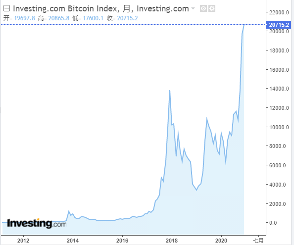 实际上,就在今年11月份,比特币就连破了1.4万-1.9万美元关口,屡次逼近2万美元。英为财情数据显示,11月30日比特币一度涨至19698美元。12月份前半个月,比特币价格稍有回落,但也一直保持在18000美元上方。