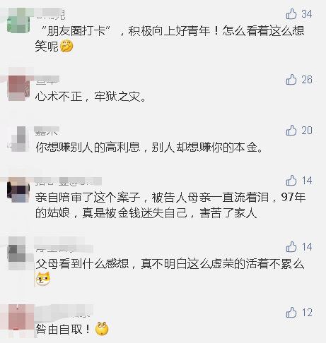 在该“白富美”被判后,有网友表示,“亲自陪审了这个案子,被告人母亲一直流着泪,97年的姑娘,真是被金钱迷失自己,害苦了家人。”