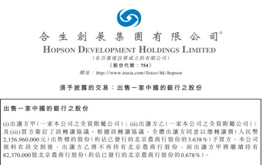 12月11日,合生创展集团(00754.HK)发布公告称,旗下两家子公司中先国际控股有限公司(下称“中先国际”)及上海大展投资管理有限公司(下称“大展投资”)同意出让4.42亿股北京农商行股份(约占已发行的北京农商行股份的3.638%),总转让价约21.57亿元。
