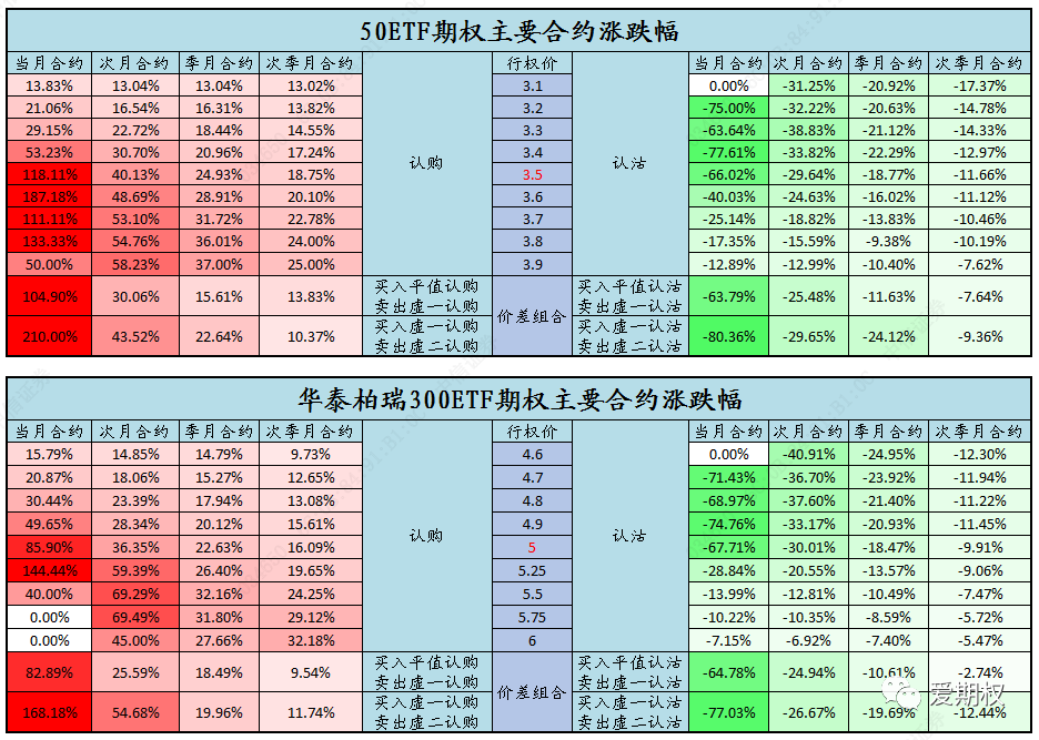 期权标的全日持续上行。今日A股全日持续上行,券商、医药、金属板块发力,沪指重回3400点。期权标的方面,50ETF上涨1.58%,华泰柏瑞300ETF上涨1.41%、嘉实300ETF上涨1.34%,沪深300上涨1.28%。