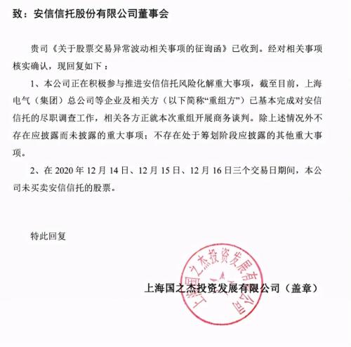 值得注意的是,此次安信发布了两个公告,分别对应两个主体。一个是安信信托,另一个就是控股股东国之杰。