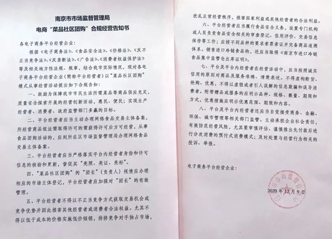 对此,江苏省南京市市场监管局12月9日也发布了电商“菜品社区团购”合规经营告知书(以下简称《告知书》),鼓励电商平台探索开展惠民、便民经营创新活动,但同时要求其不得以不正当竞争方式获取交易机会或竞争优势并因此损害其他经营者或消费者合法权益,尤其不得以低于成本的价格实施低价倾销,排挤竞争对手独占市场,扰乱正常经营秩序,损害国家利益或其他经营者的合法利益。
