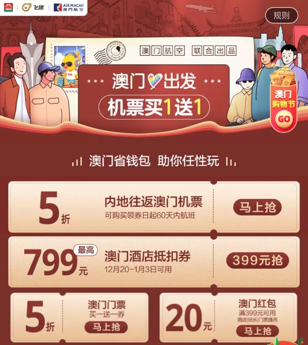 据《澳门日报》报道,疫情之下,澳门旅游业拓展了直播形式吸引消费者。澳门航空航线规划及收益管理部总经理吴文坦表示,疫情最严峻时期,业务下跌99.8%,顺应政策逐步开放和政府扩客源计划,澳航在飞猪大力度推出买一送一优惠活动,并透过直播进行营销。他形容这种营销模式“低成本、高流量”,效果比过去理想,“就算以前市场好的时候大概也只有几百张,现在一天就到2000张(机票)!”。