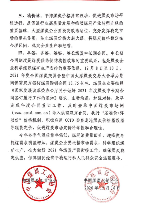 中国煤炭工业协会、中国煤炭运销协会联合发布倡议书,倡议企业做好迎峰度冬期间“保安全、保供应、稳价格”工作。大型煤炭企业要充分发挥稳定市场的带头作用,防止煤炭价格大起大落,将煤炭价格稳定在合理区间。