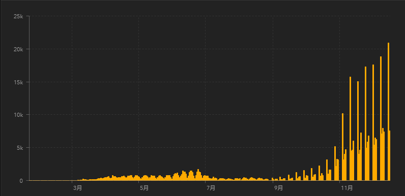 11月前后开始,瑞典单日新增确诊病例数量不断突破记录 截图:约翰·霍普金斯大学