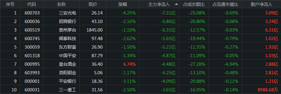 从个股来看,三安光电、招商银行、贵州茅台分别遭主力资金卖出7.31亿元、6.86亿元、6.31亿元。