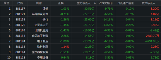 主力资金流出的板块分别是证券、半导体及元件、银行,主力资金流出金额分别为30.51亿元、27.13亿元、25.62亿元,其中散户净流入金额为8.20亿元、4.07亿元、8.15亿元。