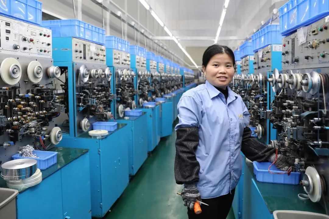 龙亚佗是广西金佳电子公司的员工,她正在检查电子元器件的生产情况,每月收入达到3000元至5000元。在家门口就能找到一份收入稳定的工作,她感到很开心。