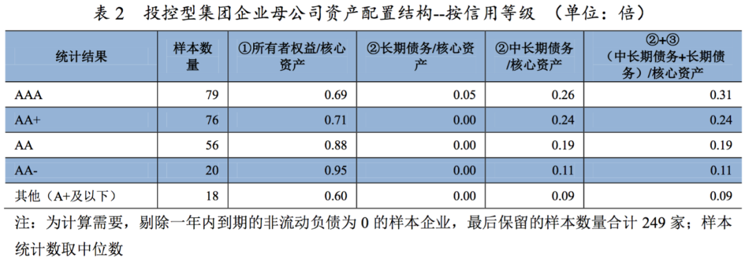 资产负债匹配程度是考察企业财务政策是否稳健的重要指标之一,本文通过对249家不同信用等级的投控型集团企业样本母公司在资本配置方面的财务表现进行分析发现,高信用等级的企业母公司权益对核心资产的覆盖程度反而更低,因为外部融资渠道方面的便利使得高信用等级的企业可以灵活选用“权益+杠杆”的模式满足核心资产配置需要,从而有效控制资金成本、提升资金使用效率;而低信用等级的样本企业核心资本配置对于自有权益的依赖程度相对较高,一定程度限制其经营规模的扩张;经营策略较为激进的企业甚至采用“短债长投”的策略,加大资金滚续压力,在外部融资环境收缩的情况下面临信用风险暴露的风险。