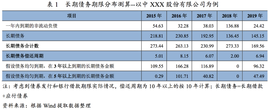 本文提出,在只有公开资料可获取的情况下,可以通过公司长期债务中一年以内到期部分(在“一年内到期的非流动负债”科目计量)在整体长期债务中的占比测算长期债务偿还周期和未来到期分布情况。