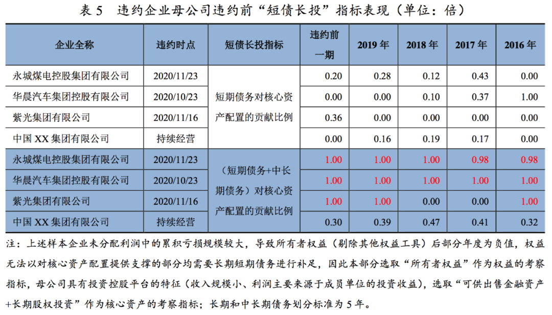 通过对近年来违约的投控型集团企业母公司进行分析,我们发现,投控型集团企业母公司中的违约样本长期资本对核心资产的贡献比例不足,“短债长投”现象普遍存在,并且,违约样本企业可能在违约前的较长期间内资产负债错配程度处于高位,最终在外部融资环境收缩的情况下发生信用风险暴露。本文提出的“短债长投”量化指标在揭示投控型集团企业母公司的资产负债错配程度以及风险预警方面有一定借鉴意义。