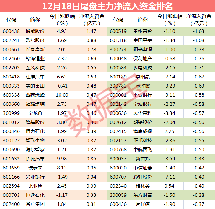 从个股尾盘资金流向数据看,有6股尾盘净流入资金超过5000万元,通威股份、歌尔股份、长春高新等个股尾盘资金净流入金额最多,分别高达1.47亿元、0.88亿元、0.78亿元;贵州茅台、中国平安、阳光电源等个股尾盘资金净流出金额最多。